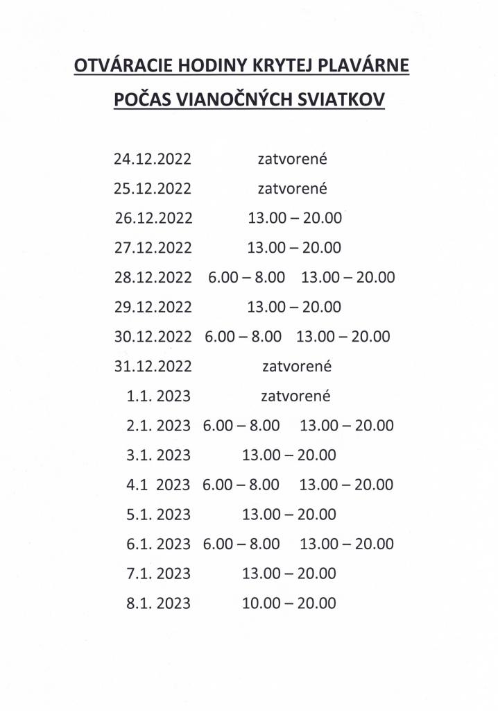 Správa majetku Mesta Myjava, s. r. o. ako prevádzkovateľ mestského športového areálu oznamuje verejnosti otváraciu dobu krytej plavárne počas vianočných sviatkov.