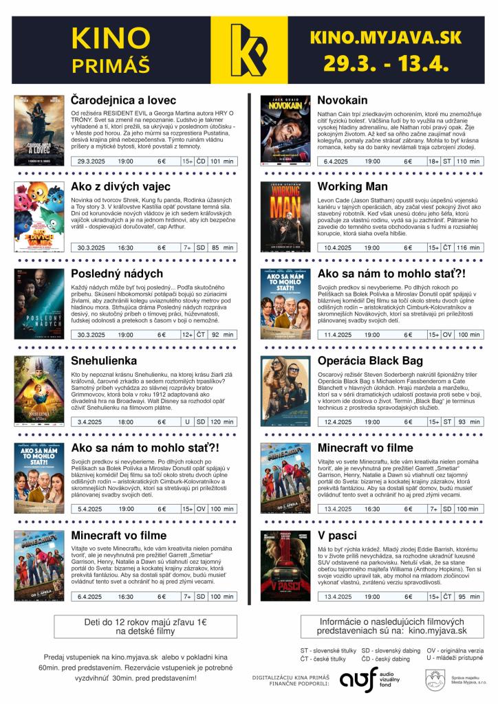Správa majetku Mesta Myjava, s. r. o. ako prevádzkovateľ Kina Primáš v Kultúrnom dome Samka Dudíka zverejňuje program kina od 29. marca do 13. apríla 2025.