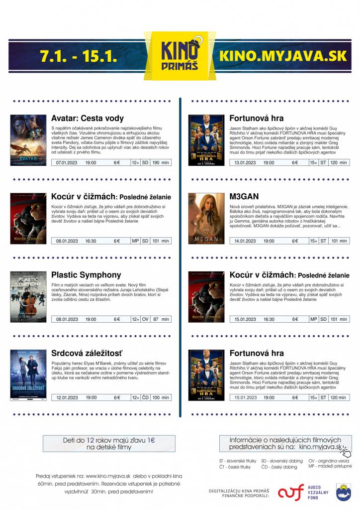 Správa majetku Mesta Myjava, s. r. o. ako prevádzkovateľ Kina Primáš v Kultúrnom dome Samka Dudíka zverejňuje program kina od 7. januára do 15. januára 2023.